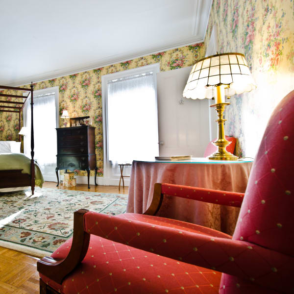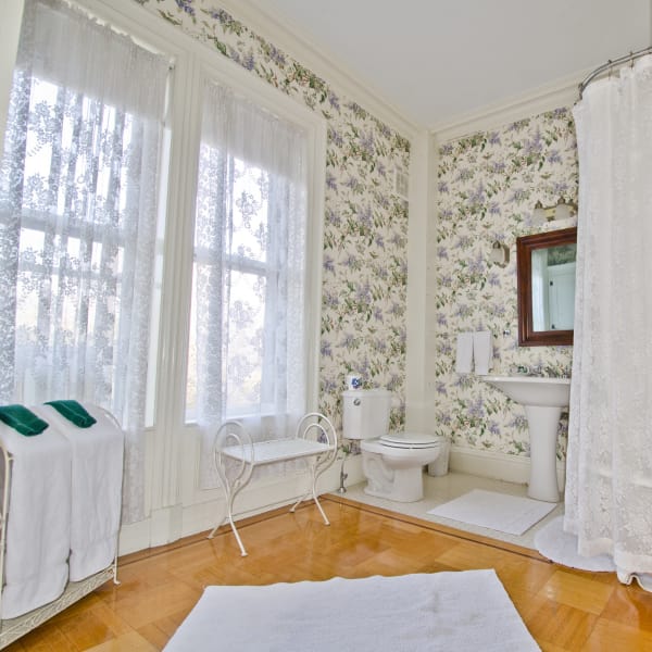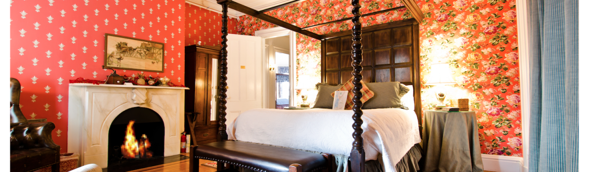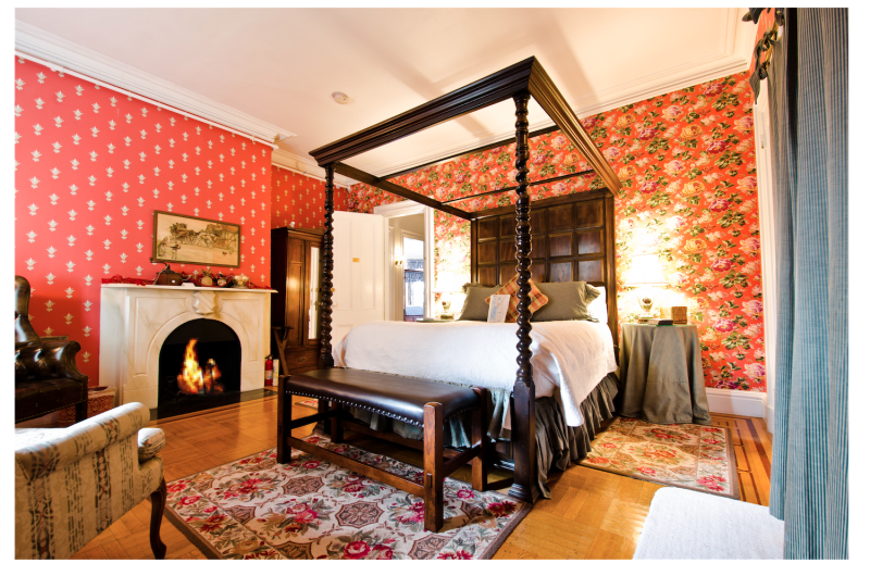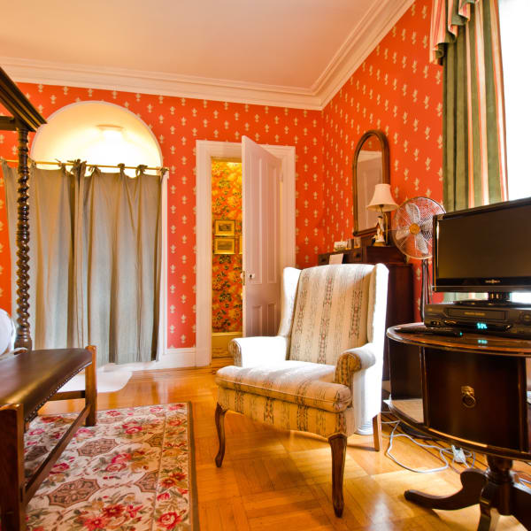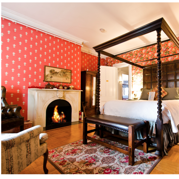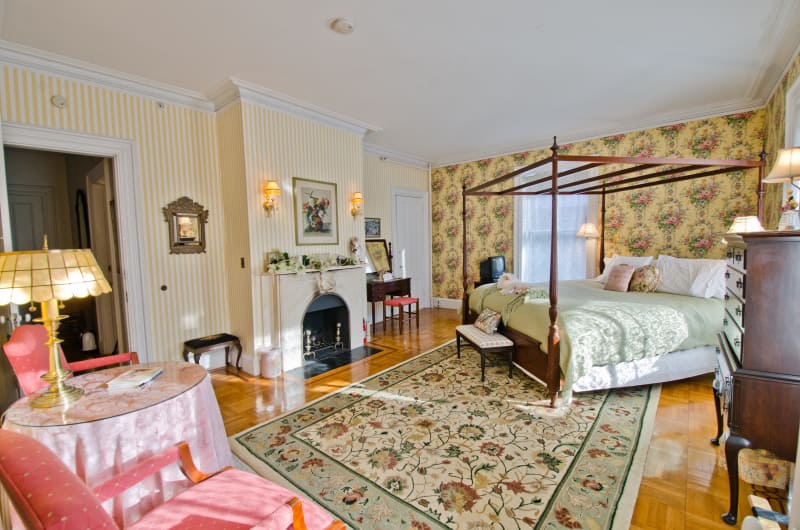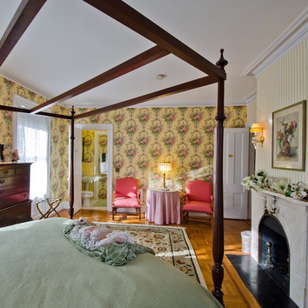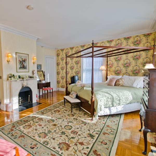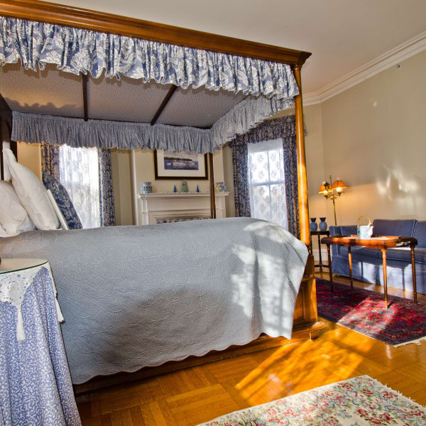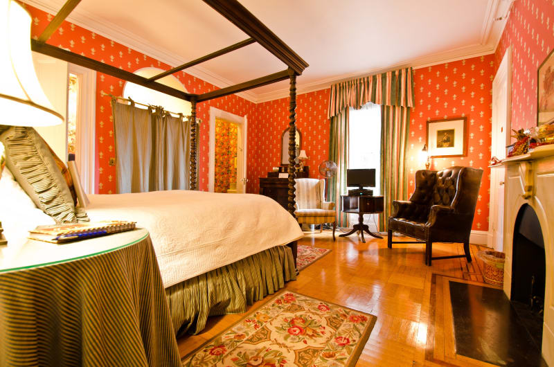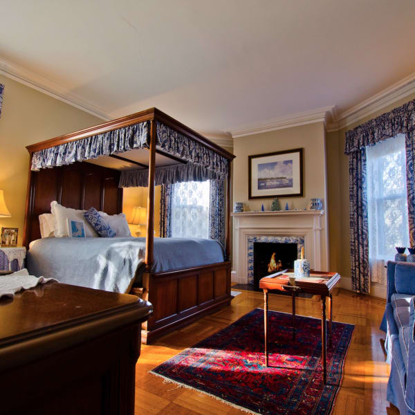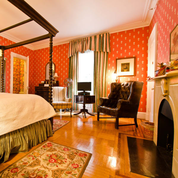 The original master room of the mansion, this room has lovely charm including a fireplace and rather large bathroom. The queen canopy bed adds a touch of romance as well.